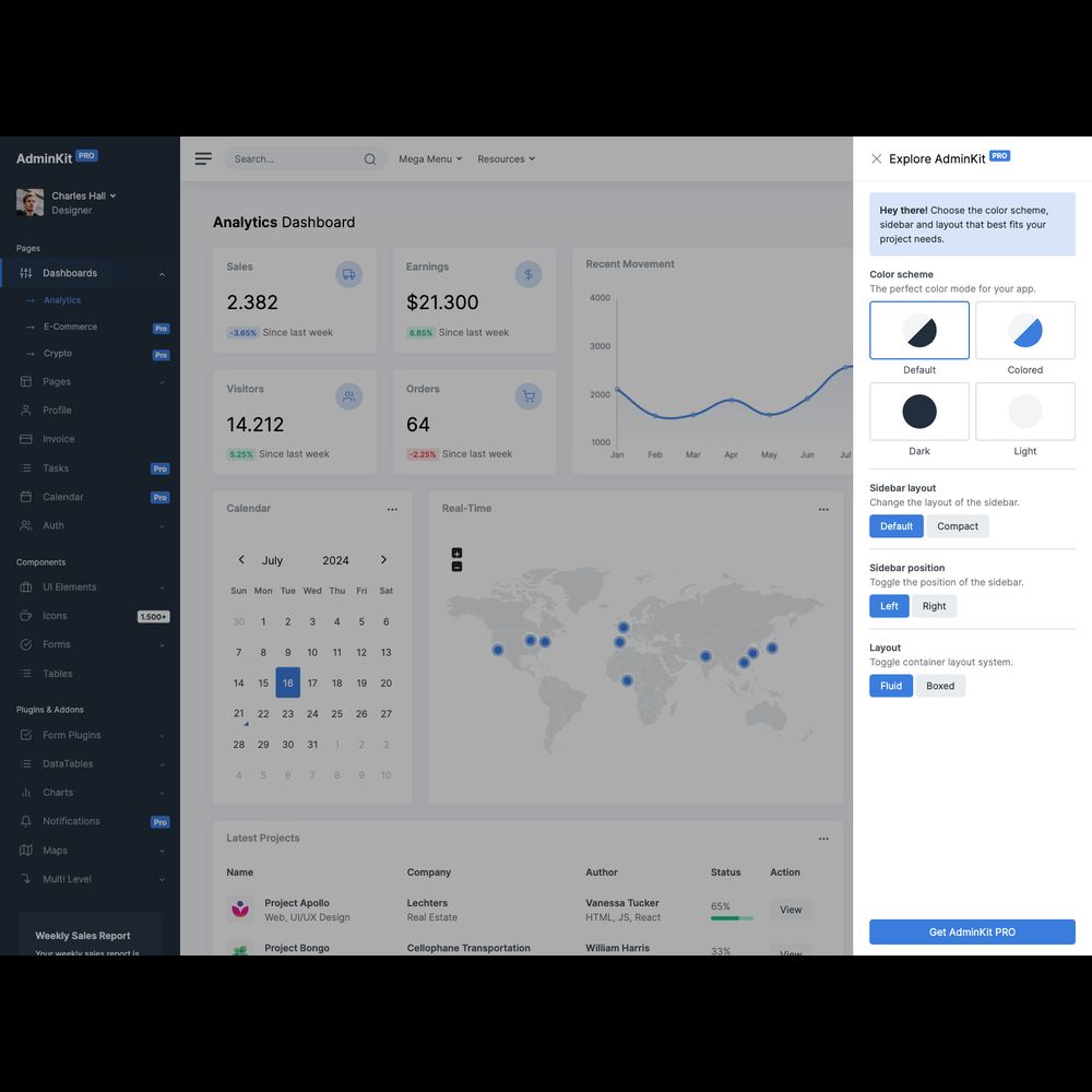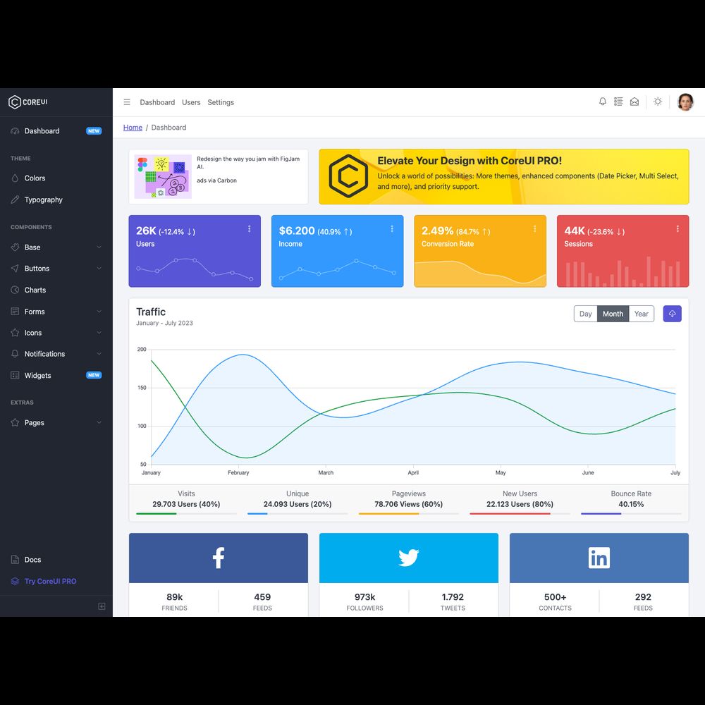 A professional Admin & Dashboard template based on Bootstrap 5 that comes with hundreds of UI components, forms, tables, charts, pages and icons.