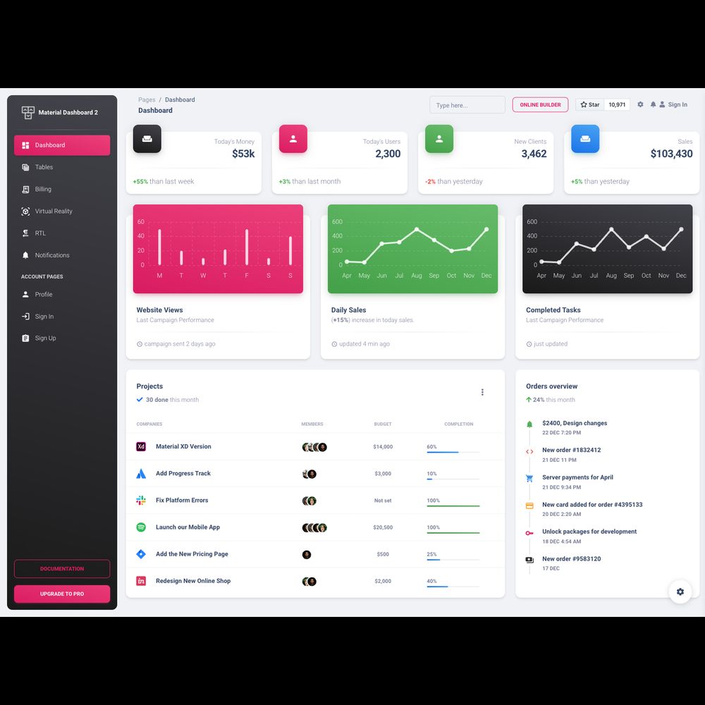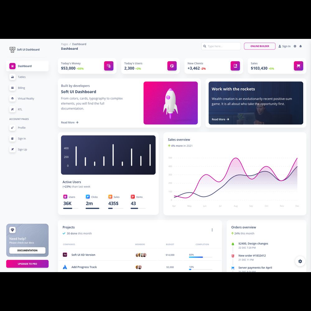 Designed for those who like bold elements and beautiful websites. Made of hundred of elements, designed blocks and fully coded pages, Soft UI Dashboard is ready to help you create stunning websites and webapps.