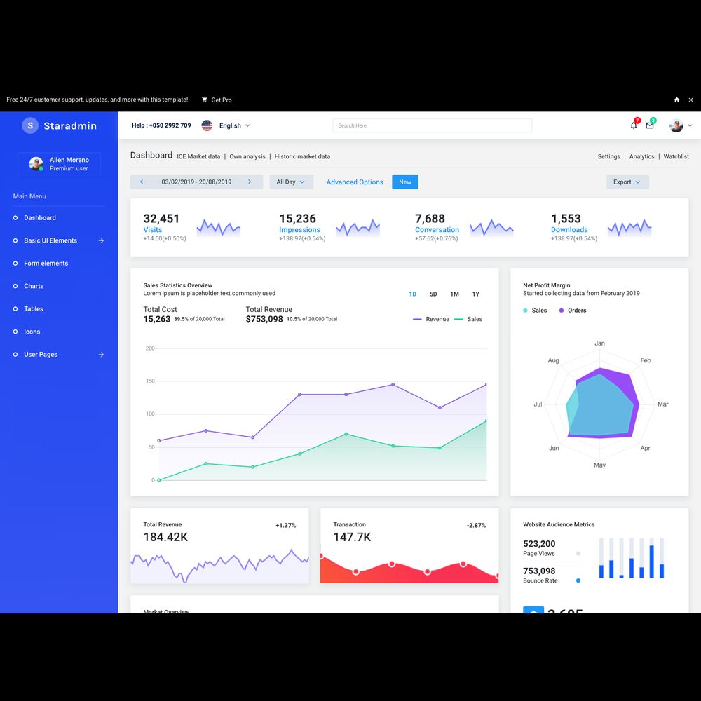 Star Admin is a free responsive admin template built with Bootstrap 4. The template has colorful, attractive yet simple and elegant design.
