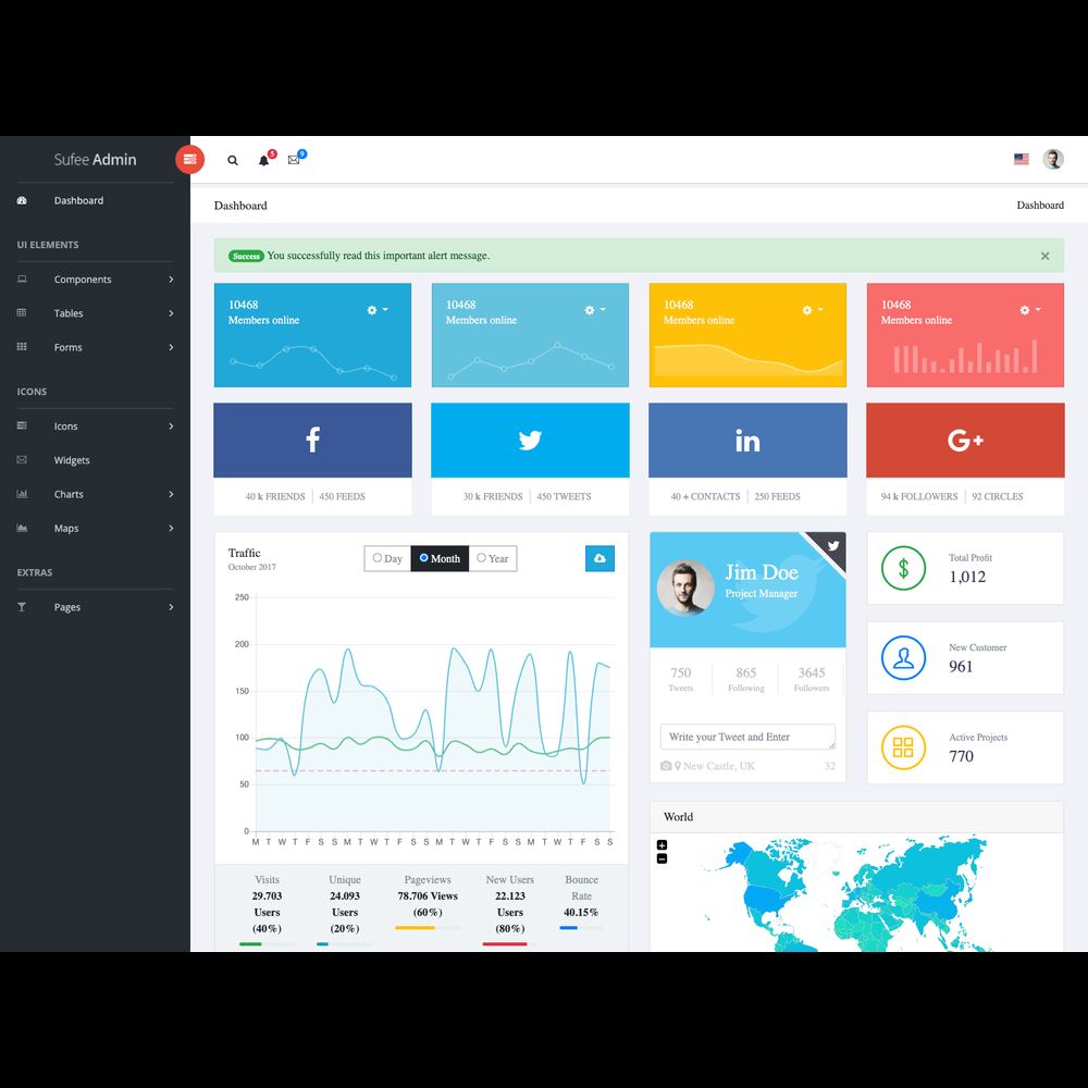 Sufee is a responsive Bootstrap 4 Admin Template. It provides you with a collection of ready to use code snippets and utilities, custom pages, a collection of applications and some useful widgets.