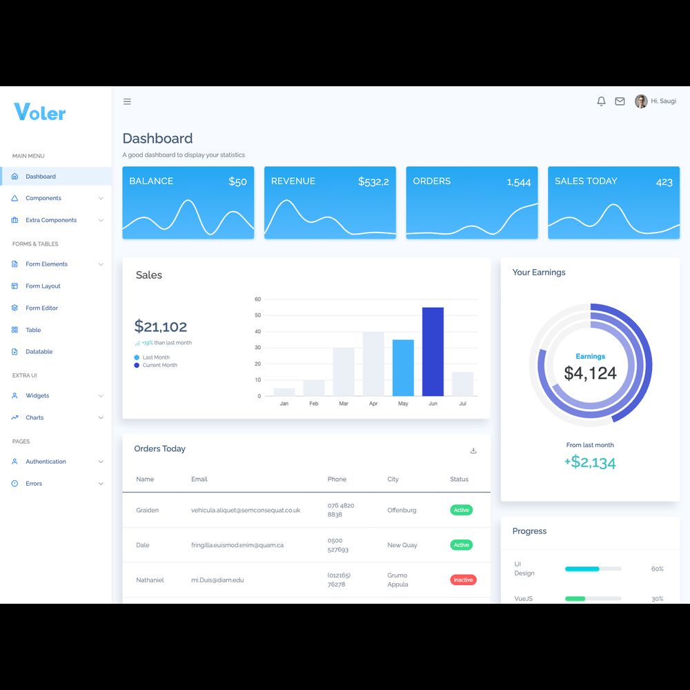 Voler is a Admin Dashboard Template that can help you develop faster. Made with Bootstrap 5 Alpha.