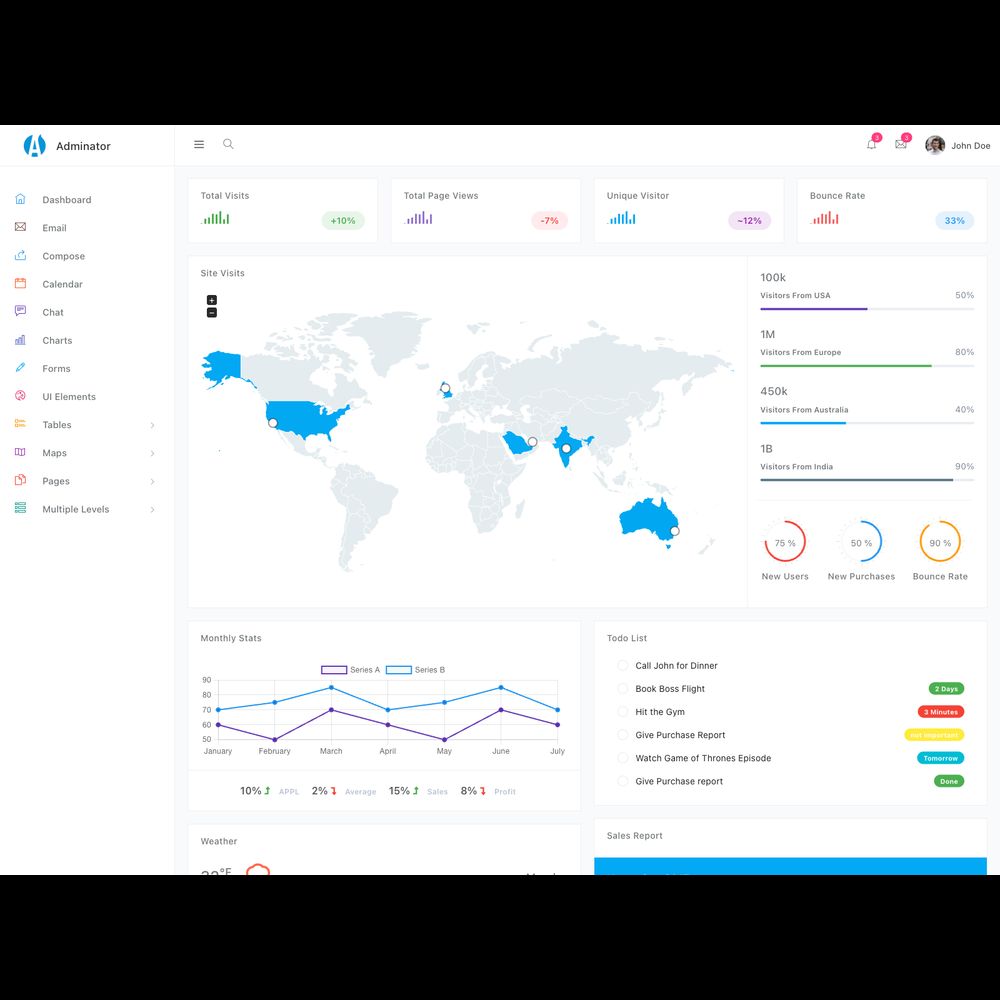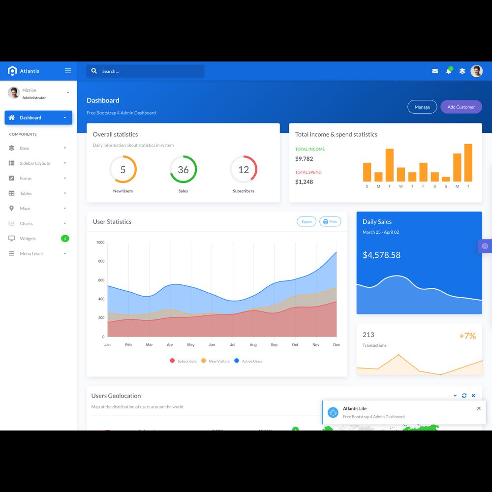Atlantis Lite is a free bootstrap 4 admin dashboard that is beautifully and elegantly designed to display various metrics, numbers or data visualization.